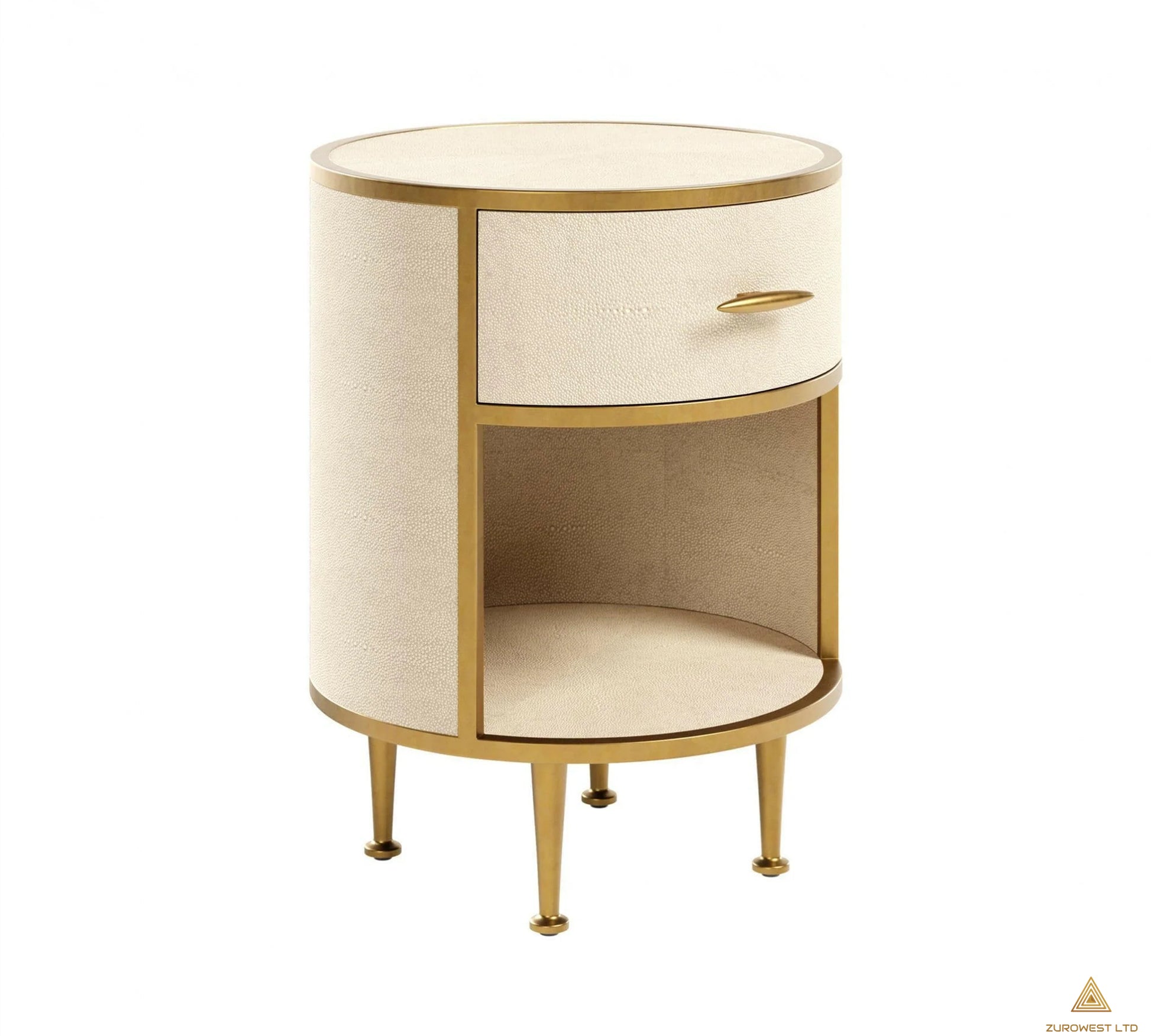 The Eckler nightstand, a round nightstand with one drawer, is crafted in ivory-colored simulated shagreen with a brass-style frame, legs, and handles, and a walnut-style wood drawer interior. Metal runners, handles, and legs are available separately.