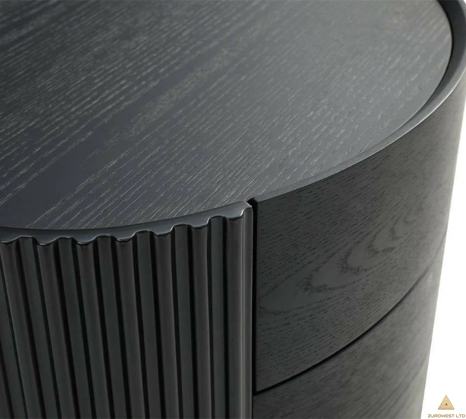 The Oliver nightstand adds an elegant and stylish touch to your bedroom. Featuring two drawers, a matte black oak tabletop, and doors, it's ideal for storing bedtime essentials. Ribbed edges and brass legs add a finishing touch. This versatile piece of furniture adds a touch of modern flair to any room.